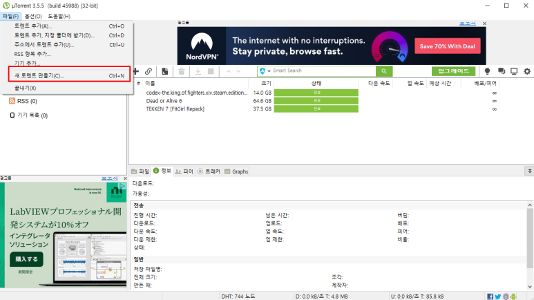 좌측상단 파일을 클릭후 하위메뉴에서 새 토렌트 만들기를 클릭해줍시다