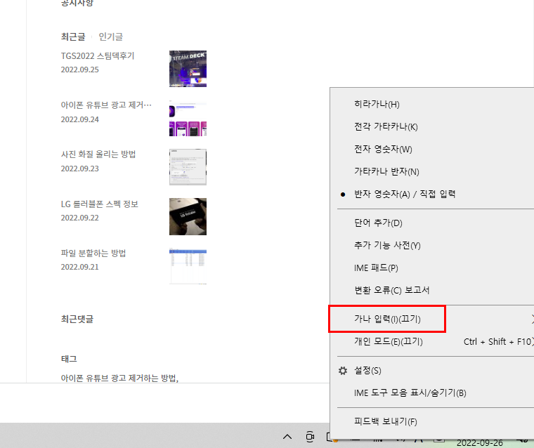 우측클릭을 하면 메뉴가 나오는데 여기에서 가나입력을 선택해줍시다