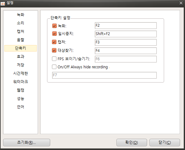 기본 녹화 시작, 종료 버튼은 F2버튼이며 설정에서 변경가능합니다