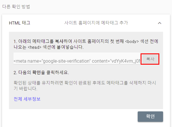 위 스크린샷처럼 헤드 아래에 복사한 메타값을 붙여넣기한뒤 적용을 눌러줍시다